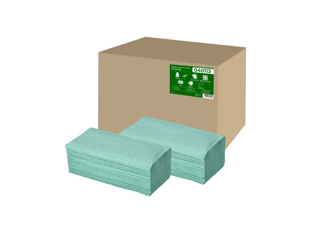 Jednorázové dvouvrstvé papírové ručníky 24 × 21 cm, zelené, vyrobené z kvalitní celulózy, vhodné pro dávkovače, do kanceláří, restaurací a provozů s vysokou frekvencí používání.