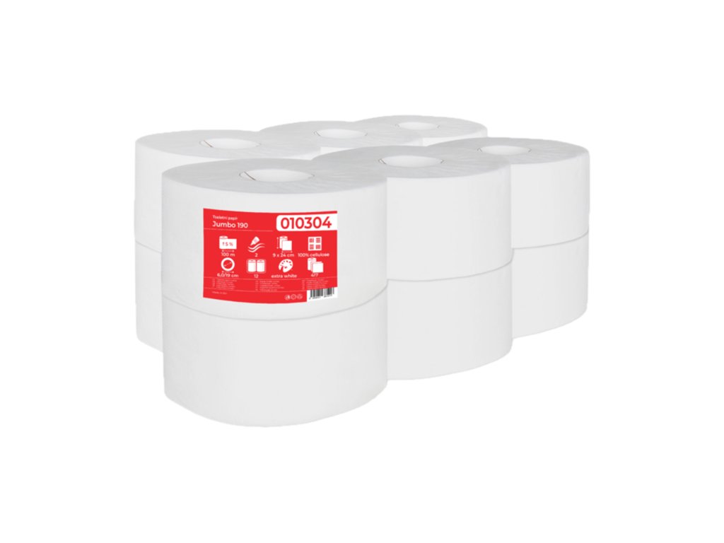 Toaletní papír Jumbo 190 – 2-vrstvý, extra bílý a odolný, vyrobený z kvalitní celulózy. Dlouhá role 100 m minimalizuje časté výměny a je ideální pro profesionální provozy i veřejné toalety.